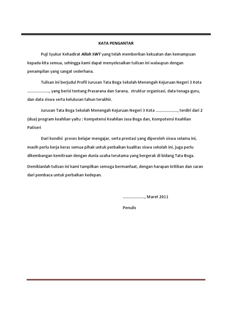 Profil kesehatan puskesmas keman ini merupakan bagian penting dari system kesehatan kabupaten yang digunakan sebagai sarana untuk memantau dan mengevaluasi pencapaian kabupaten sehat dan hasil kinerja penyelenggaraan standar pelayanan kesehatan minimal (spm). Terkadang, kata pengantar tidak dibuat oleh penulis, melainkan oleh pihak lain yang mememiliki peran. Seperti dengan namanya, kata pengantar adalah ucapan rasa syukur, terima kasih dan sambutan dari penulis kepada karya tulis yang sudah dibikinnya tersebut. Puji syukur kami panjatkan kehadirat tuhan yang maha esa sehingga kami telah menyelenggarakan kegiatan pengembangan sekolah model dan pola pengimbasan program penjaminan mutu pendidikan di sekolah model smpn 1 praya timur kab/kota lombok tengah. Penulisan dan pembuatan makalah ini bertujuan untuk memenuhi tugas mata kuliah bahasa indonesia. Tetapi tenang karena contoh pengantar makalah yang akan kami bagikan bisa langsung anda copy dan paste ke makalah yang sedang dibuat. Karena tanpa hadirnya kata pengantar, sebuah. Memerlukan referensi contoh kata pengantar yang baik dan benar, anda tidak perlu kuatir lagi. Adapun tujuan dari penulisan dari makalah ini adalah untuk memenuhi tugas dosen/guru. Masukuniversitas sebagai informasi untuk keperluan pendidikan yang tepat untuk anda. Kata pengantar yang benar adalah kata pengantar yang isinya terstruktur dengan baik. Kata pengantar ditulis pada halaman tersendiri, artinya tidak bersatu dengan bagian lain. Karena makalah atau laporan akan sesuai dengan namanya, kata pengantar adalah ucapan rasa syukur dan terima kasih serta sambutan dari penulis terhadap karya tulis yang telah.