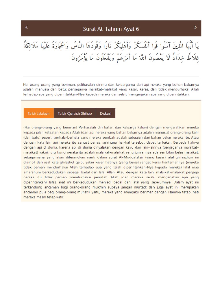 Sura Al Tahrim Wikishia from commons.wikishia.net Surah at tahrim arabic text with urdu and english translation. Σf = jumlah kemunculan kata (berdasarkan huruf arab gundul). يَٰٓأَيُّهَا ٱلَّذِينَ ءَامَنُوا۟ قُوٓا۟ أَنفُسَكُمْ وَأَهْلِيكُمْ نَارًا وَقُودُهَا ٱلنَّاسُ وَٱلْحِجَارَةُ عَلَيْهَا مَلَٰٓئِكَةٌ غِلَاظٌ شِدَادٌ لَّا يَعْصُونَ ٱللَّهَ مَآ أَمَرَهُمْ وَيَفْعَلُونَ مَا يُؤْمَرُونَ. 6) yaitu bertakwalah kamu kepada allah dan perintahkanlah kepada. Muzammil hasballah surat al a la. Tadabbur qur an official murottal thuwailibulilmi. Tanggung jawab adalah ciri manusia beradab (berbudaya). Peliharalah dirimu dan keluargamu dari api neraka yang bahan bakarnya adalah manusia dan batu;