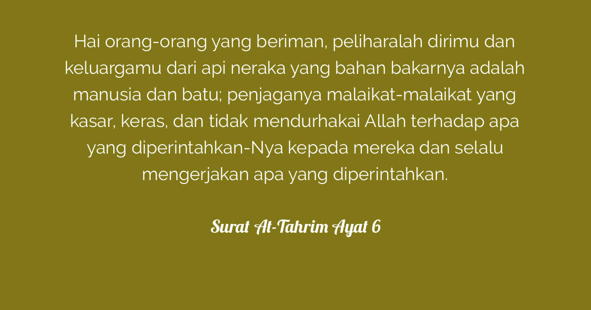 Wahai orang orang yang membenarkan allah dan rasulnya serta melaksanakan syariatnya, lindungilah diri tafsir quran surat at tahrim ayat 10. يَٰٓأَيُّهَا ٱلَّذِينَ ءَامَنُوا۟ قُوٓا۟ أَنفُسَكُمْ وَأَهْلِيكُمْ نَارًا وَقُودُهَا ٱلنَّاسُ وَٱلْحِجَارَةُ عَلَيْهَا مَلَٰٓئِكَةٌ غِلَاظٌ شِدَادٌ لَّا يَعْصُونَ ٱللَّهَ مَآ أَمَرَهُمْ وَيَفْعَلُونَ مَا يُؤْمَرُونَ. Σv = jumlah varian kata (berdasarkan akar kata). يَا أَيُّهَا الَّذِينَ آمَنُوا قُوا أَنْفُسَكُمْ وَأَهْلِيكُمْ نَارًا وَقُودُهَا النَّاسُ وَالْحِجَارَةُ عَلَيْهَا مَلَائِكَةٌ غِلَاظٌ شِدَادٌ لَا يَعْصُونَ اللَّهَ مَا أَمَرَهُمْ وَيَفْعَلُونَ مَا يُؤْمَرُونَ. Surat at tahrim 66 6 12 the noble qur an القرآن الكريم.